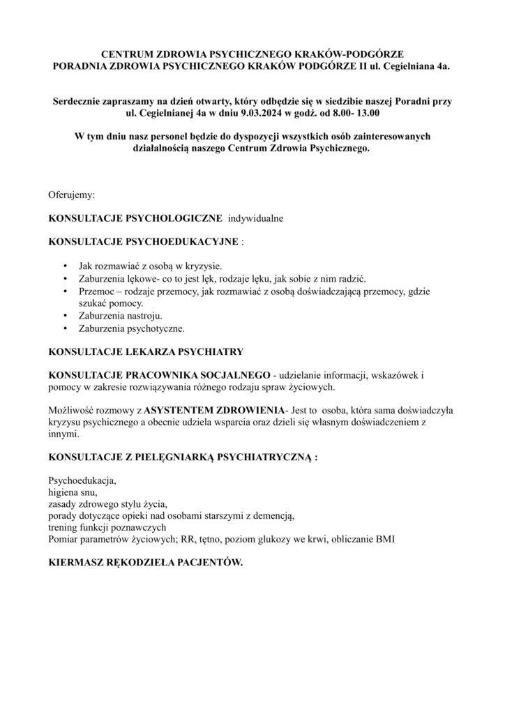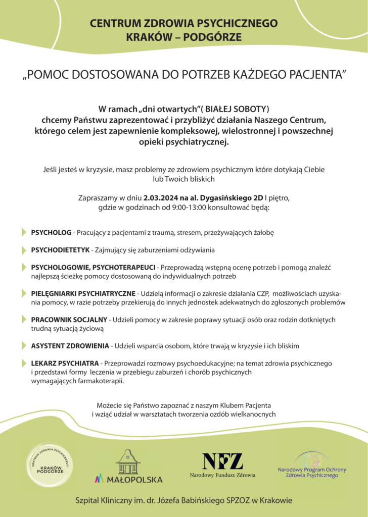 2 marca zapraszamy do Centrum Zdrowia Psychicznego Małopolska Południe w Skawinie przy ul. Energetyków 16 oraz Centrum Zdrowia Psychicznego Kraków Podgórze Al. Dygasińskiego 2d.