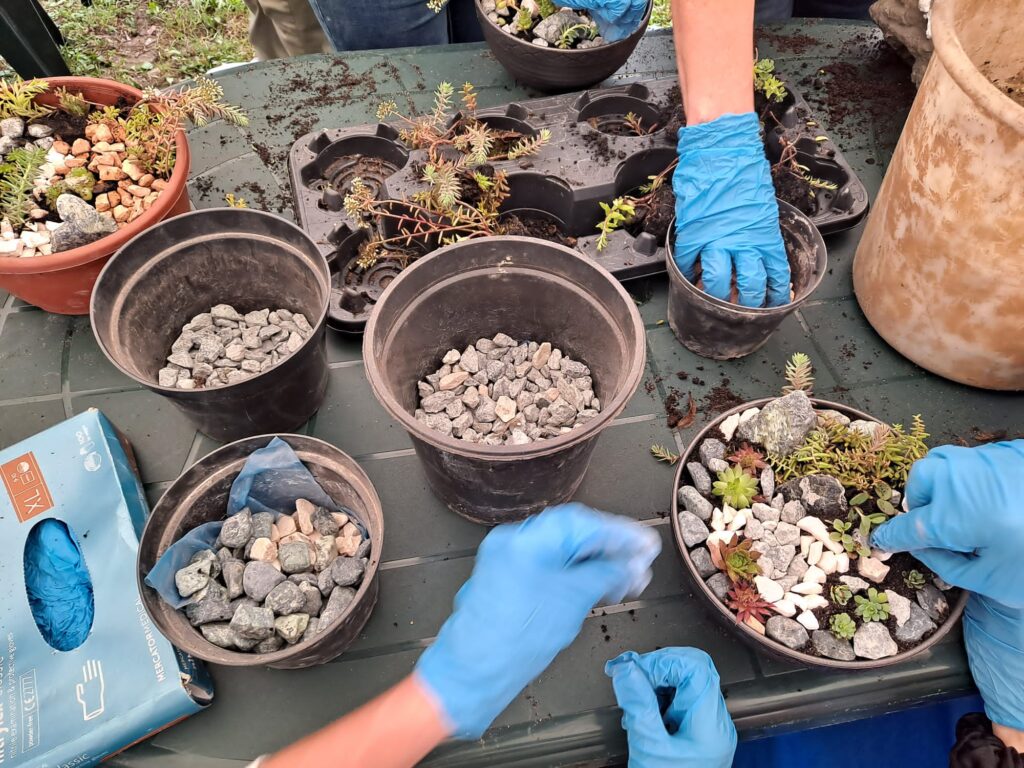 Drugim, tym razem zamkniętym dla publiczności, wydarzeniem tego dnia były wspólne warsztatu z Hortiterapii z udziałem przedstawicieli naszych Gości z Ukrainy – Grupy DESTIGMA oraz Pacjentek oddziału 5B. Hortiterapia – polega na różnego rodzaju pracy z roślinami – stała się od niedawna dzięki zaangażowaniu naszej Hortiterapeutki pani Elżbiety Filek, jedną ze specjalności kobierzyńskiego Szpitala, a proponowana Pacjentom w ramach terapii zajęciowej, cieszy się niezmiennym powodzeniem. Praca z kwiatami i roślinami to zawsze wdzięczny przedmiot zajęć terapeutycznych, pozwala bowiem poznać tajniki ich prawidłowej hodowli i pielęgnacji, rozumienie tego, jak rosną i rozwijają się, wreszcie naukę, jak o nie dbać, by były piękne. Ta wiedza i umiejętności, na pewno przydają się po opuszczeniu Szpitala, a praca, wymagająca cierpliwości i staranności, uspokaja, umożliwiając jednocześnie oderwanie się od rozedrganej rzeczywistości i własnych kłopotów. Wspólne warsztaty, podczas których powstawały miniaturowe skalne ogródki, okazały się znakomitą drogą do integracji, tak na poziomie profesjonalistów, poprzez wzajemna naukę metod terapeutycznych, jak i poznawanie się osób – tym razem z Ukrainy i z Polski.