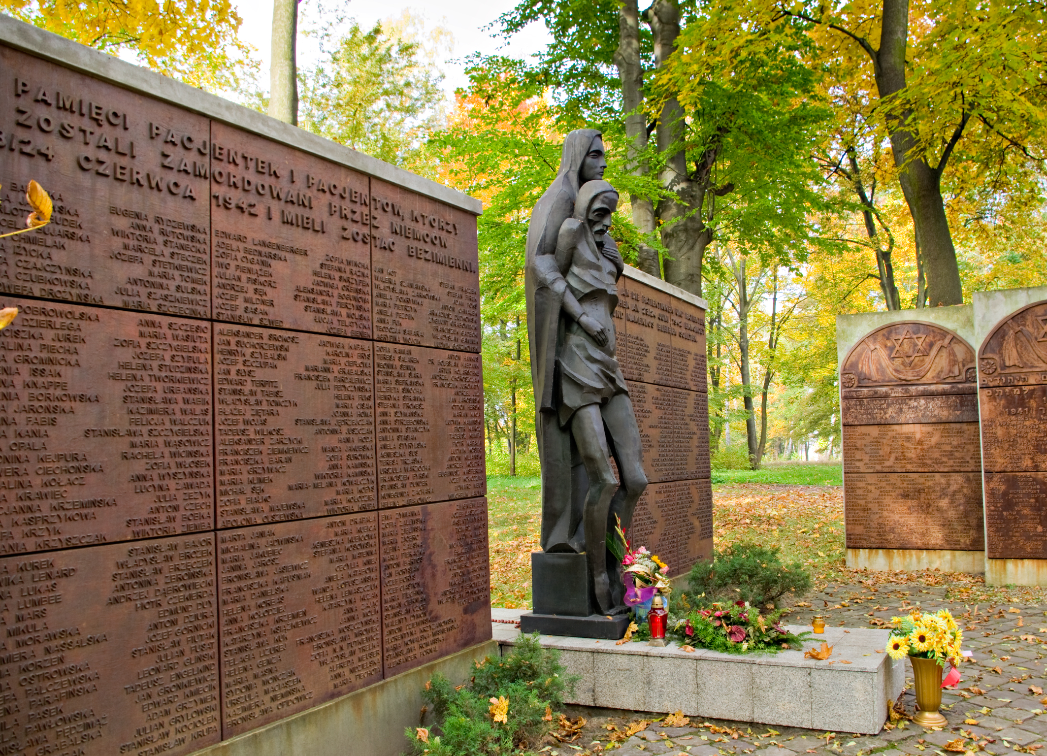 Odwiedzimy Kaplicę Szpitalną i znajdujący się obok Pomnik oraz opowiemy o Walerii Białońskiej – pacjentce oddziału 5 B, która jako jedyna, dzięki pomocy pielęgniarki i gospodarza z pobliskiej wsi, została uratowana od wywiezienia do Auschwitz i śmierci w komorze gazowej.